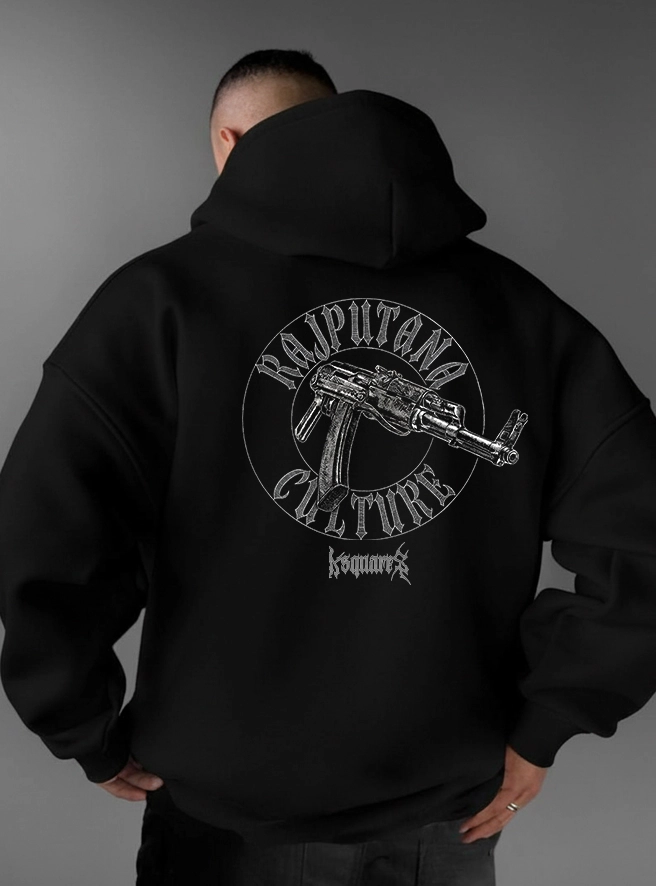 KSquaree Rajputana Culture Black Hoodie ek premium quality hoodie hai jo Rajasthani royal heritage se inspired hai. Stylish, comfortable aur winter wear ke liye perfect choice.