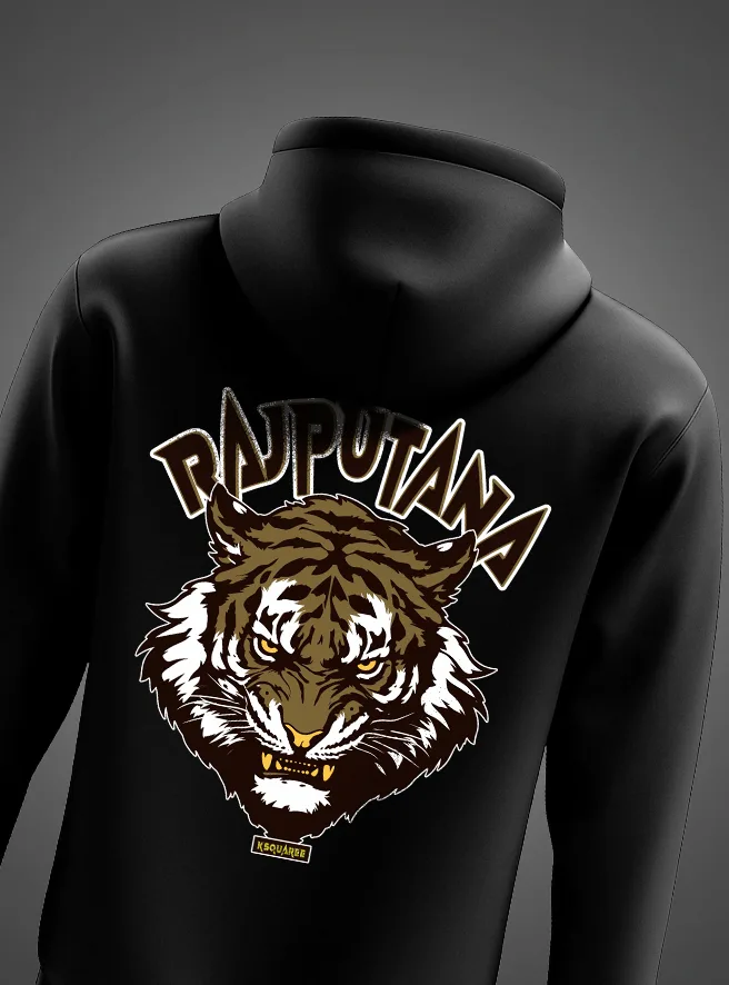 The Rajputana Tiger Face Premium Hoodie from KSquaree – Rajputana Collection represents raw power, fearless dominance, and royal Rajputana attitude.