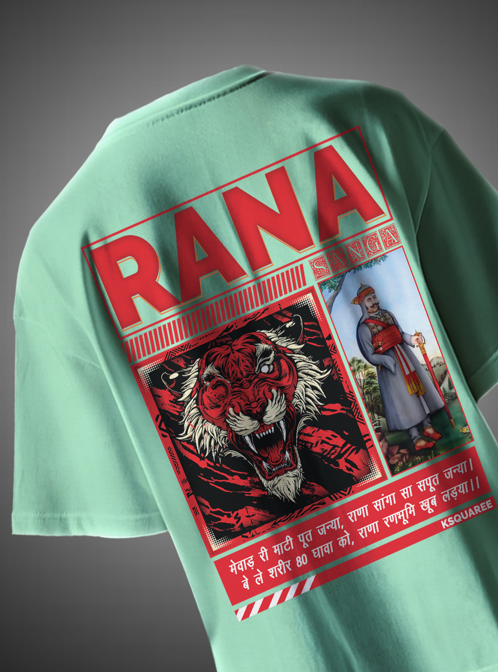 Rana Sanga Rajputana Oversized T-Shirt with bold warrior design. Premium streetwear showcasing Rajput pride by KSquaree.